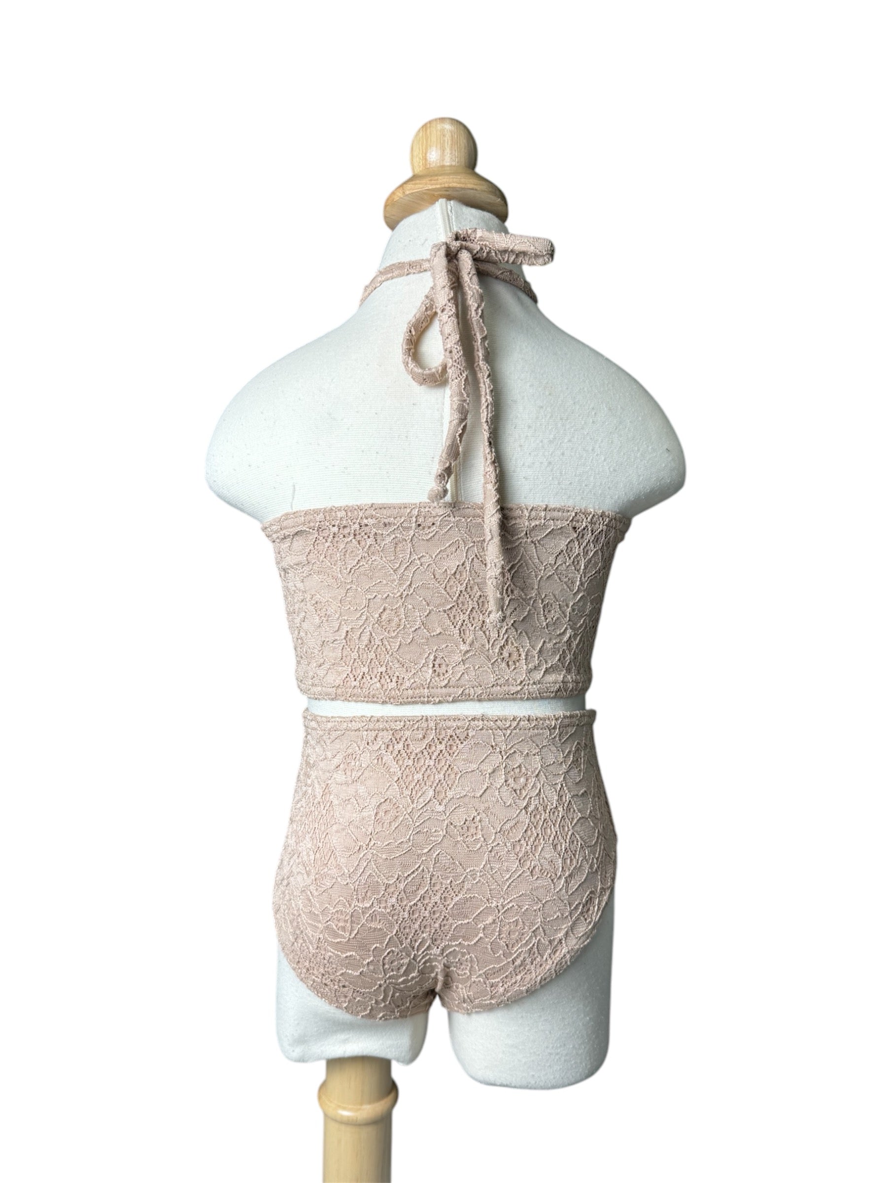This beautiful and timeless swimwear featuring bandeau neck tie with high waist bottom. Included decorative hair bow. Made for perfect for a little fashionista enjoying sunny days at the beach or poolside